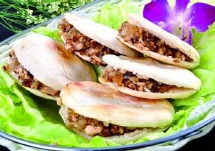 肉夾饃由臘汁肉和白吉饃組合而來(lái)。兩種食物合為一體又相互烘托,饃香肉酥,有中式漢堡的美譽(yù)。